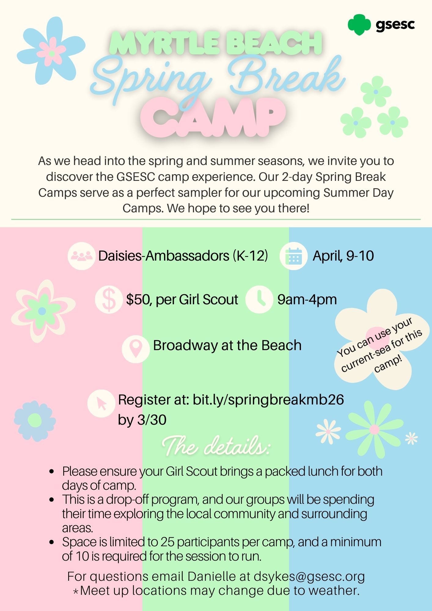 I understand the event fee(s) are non-refundable and all persons attending must be registered members of Girl Scouts of the USA, unless the event is also open to Tag-A-Longs. Girl Scout Adults attending must have a Background Check on file with GSESC. This event will take place rain or shine unless GSESC offices/facilities are closed due to weather.