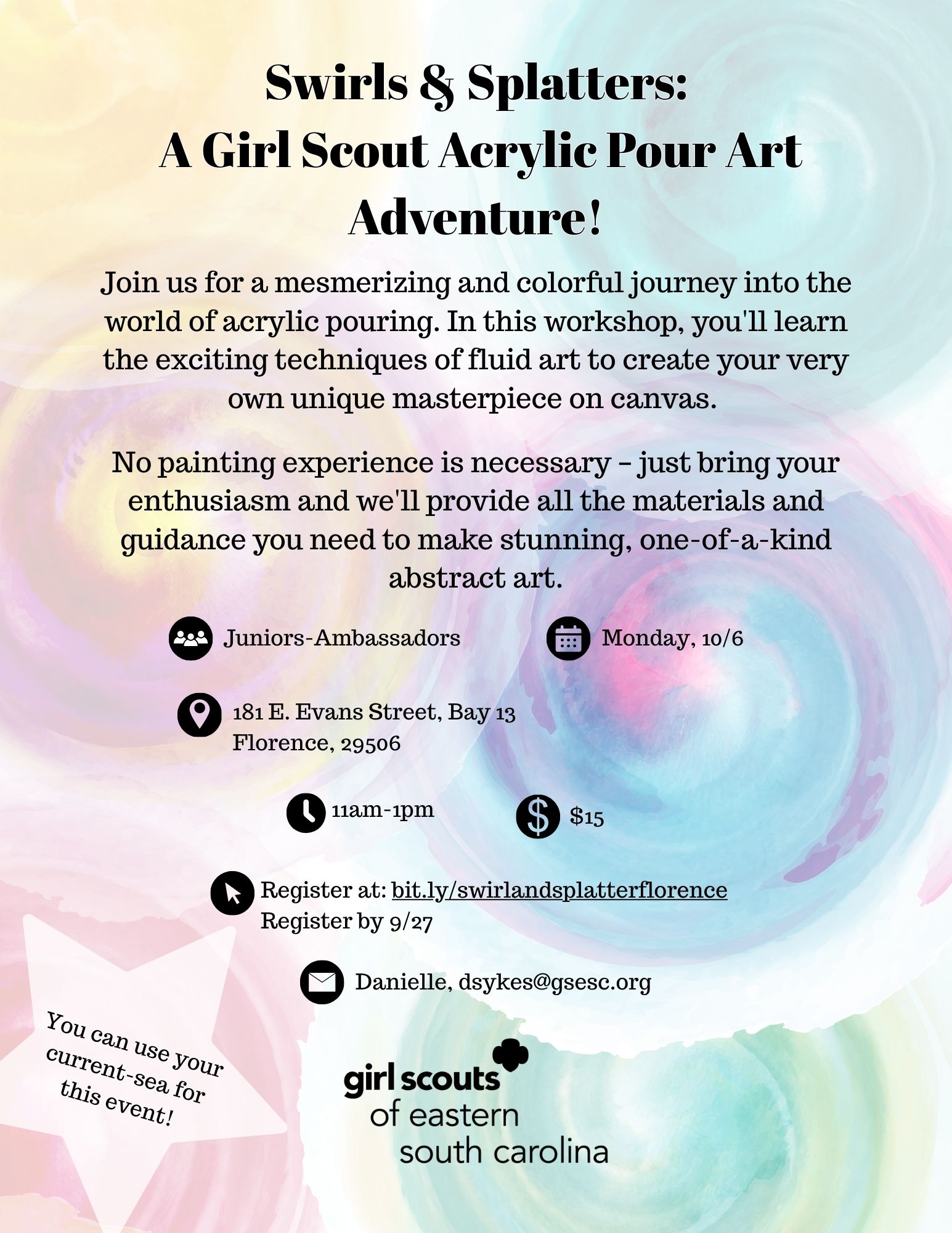 I understand the event fee(s) are non-refundable and all persons attending must be registered members of Girl Scouts of the USA, unless the event is also open to Tag-A-Longs. Girl Scout Adults attending must have a Background Check on file with GSESC. This event will take place rain or shine unless GSESC offices/facilities are closed due to weather.